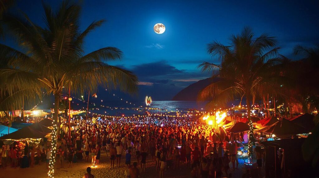 La Full Moon Party de Koh Phangan représente un phénomène unique où se mêlent festivités nocturnes et spiritualité dans un
